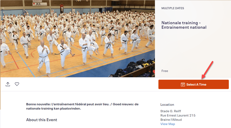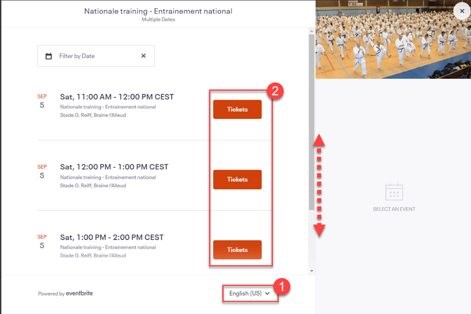 Changez la langue selon vos préférences (voir 1 – en bas à droite). Pour vous inscrire, sélectionnez «Tickets» pour l’entraînement de votre choix.